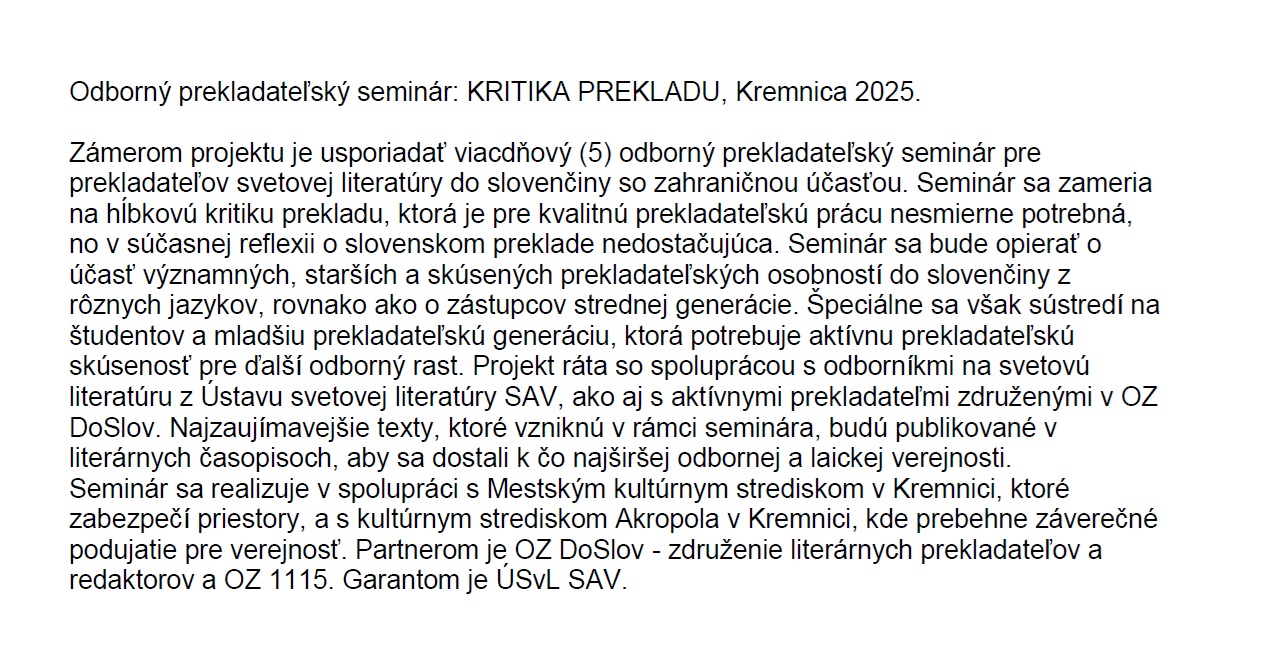 V máji 2024 sme usporiadali v Kremnici medzinárodný prekladateľský seminár s účasťou prekladateľov a prekladateľov z viacerých krajín. Odborné podujatie bolo zamerané na preklad diel slovenských autorov a autoriek najmä do nemčiny, maďarčiny, angličtiny, češtiny a poľštiny. Fotogalériu nájdete TU.
